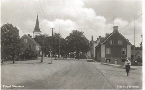 Torget i Virserum, som centrum i samhället, har under årens lopp skiftat utseende. När det här vykortet tillkom framgår inte men bilden är i alla fall tagen någon gång före 1949 eftersom Trafikkiosken ännu inte uppförts.