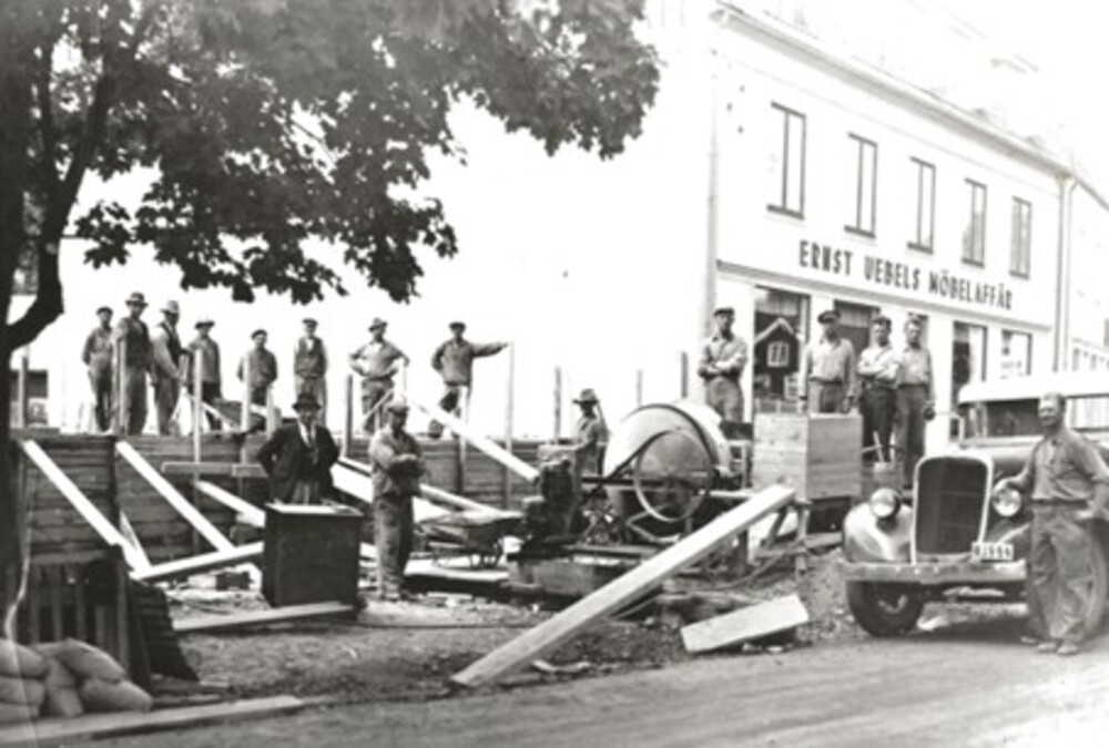 På bilden ses den nya affärslokalen under uppförande. För första gången kom därvid en cementblandare att användas vid ett bygge i Virserum.